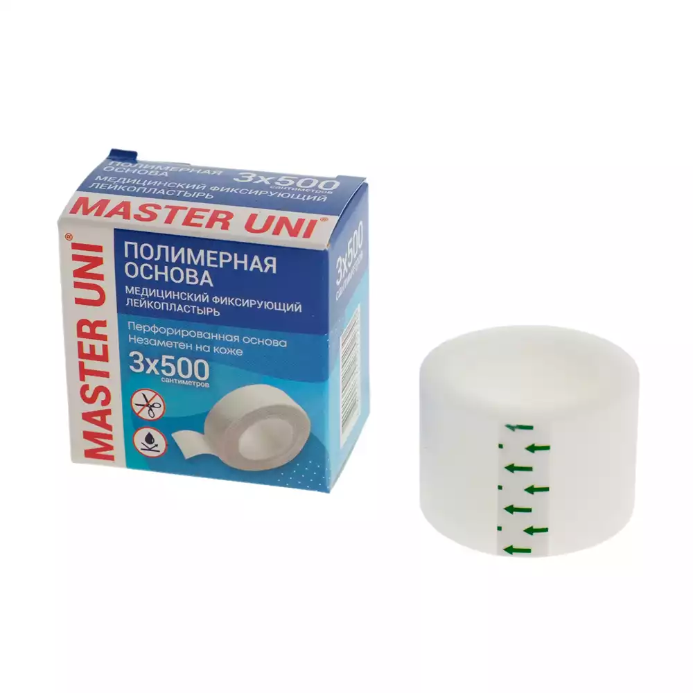Лейкопластырь Master Uni на полимерной основе, фиксирующий, размер 3см*500см, катушка в картонной коробке, ООО "ХЕЛСЛАБ" (РОССИЯ)