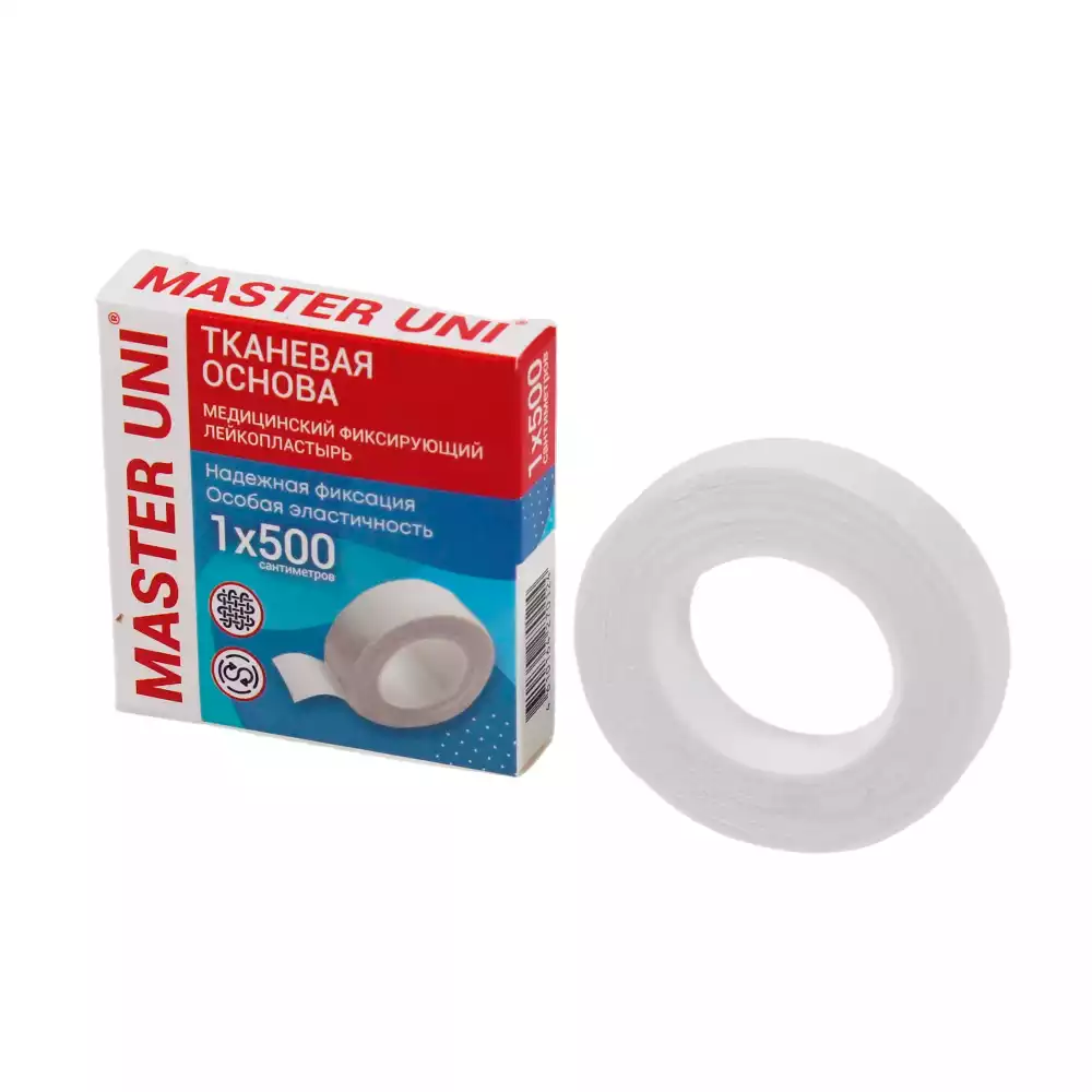 Лейкопластырь Master Uni на тканевой основе (хлопок), фиксирующий, размер 1см*500см, катушка в картонной коробкеООО "ХЕЛСЛАБ" (РОССИЯ)