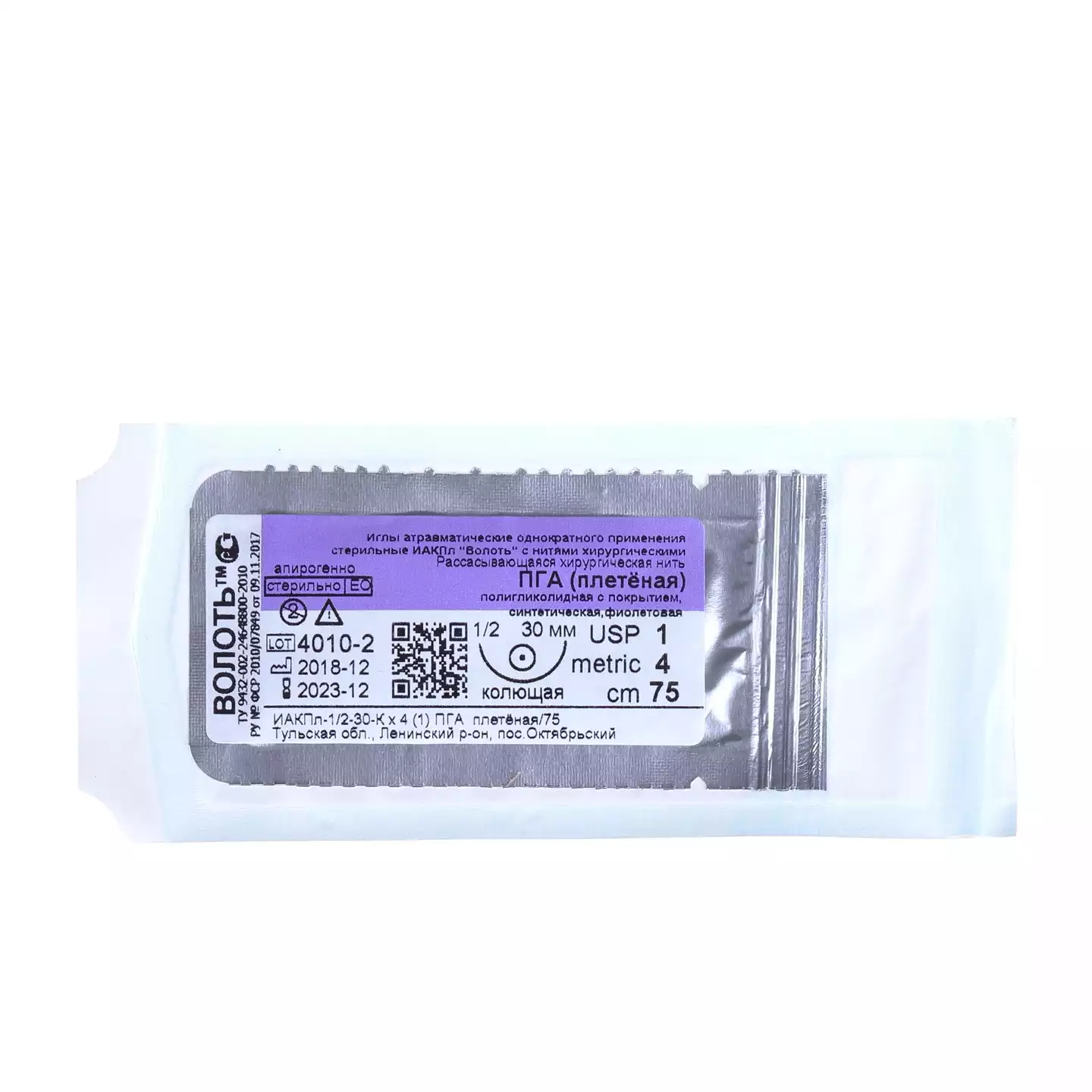 ПГА (PGA) плетеная, USP№1, длина 75см, игла 30мм, изгиб 1/2, колющая, одноигольнаяВолоть (РОССИЯ)