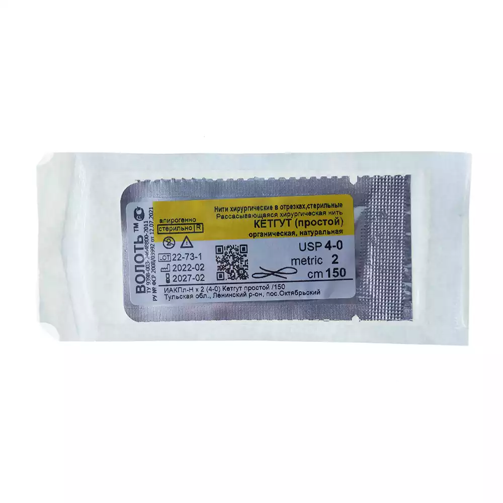 Кетгут простой USP №4/0, длина нити 150см,без иглы, стерильный, Волоть (РОССИЯ)