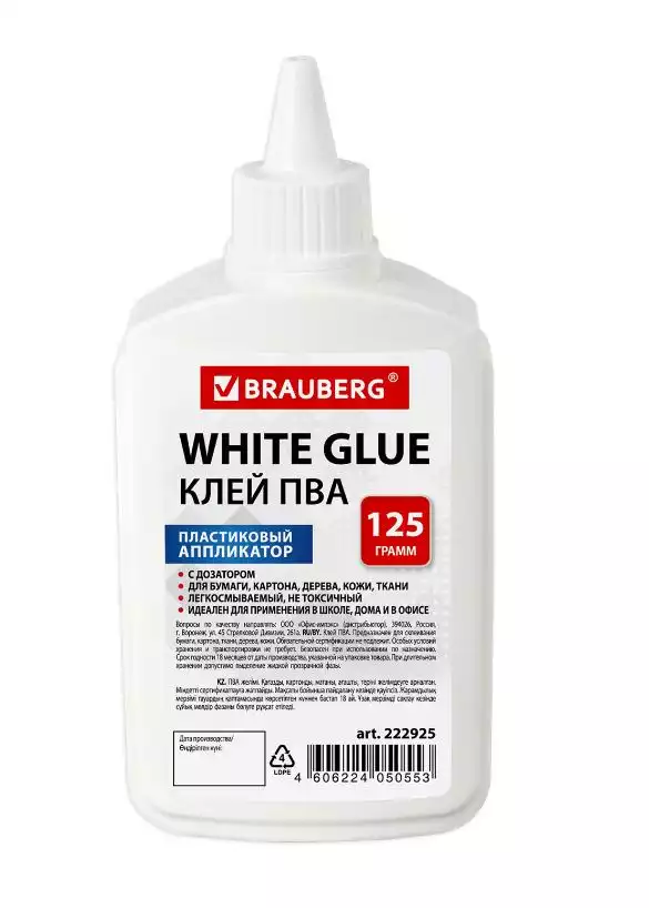 Клей ПВА BRAUBERG предназначен для склеивания бумаги, картона, фотографий, дерева. Имеет объем 125 мл. Пластиковый дозатор обеспечивает точное и равномерное нанесение. Обладает устойчивостью к морозу, не токсичен. Наносится тонким слоем, обеспечивая быстрое схватывание поверхностей, а также экономичное расходование. Съемный колпачок предохраняет клей от засыхания. Необходимо взболтать перед применением.