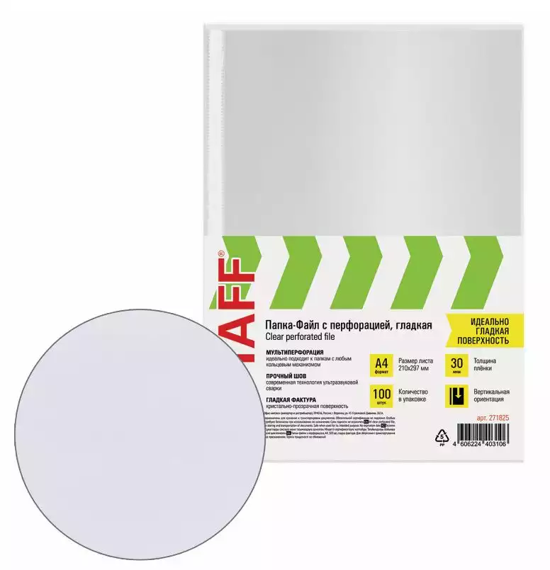 Перфорированные папки-файлы STAFF "ЭКОНОМ" предназначены для хранения документов в папке с любым кольцевым механизмом или скоросшивателем. Перфопапки формата А4 с вертикальным размещением и универсальной перфорацией имеют гладкую поверхность и прочные швы. Изготовлены из пленки толщиной 30 мкм. В комплект входят 100 перфопапок.