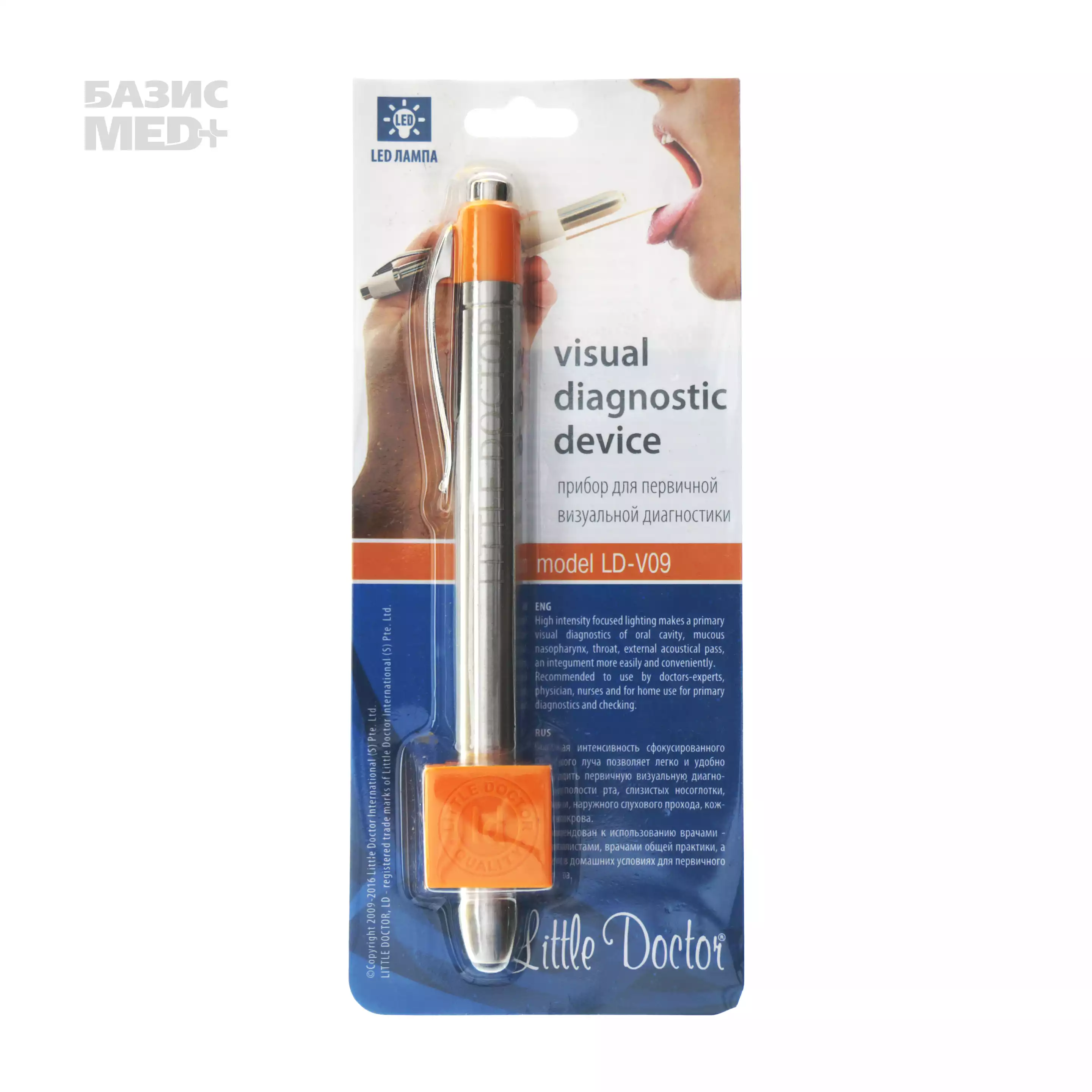 Металлический корпус прибора сделан из нержавеющей стали и имеет форму авторучки. Прибор включается и выключается легким нажатием на кнопку. В комплекте пластиковый держатель для медицинского шпателя. Питание от двух батареек типа "ААА".