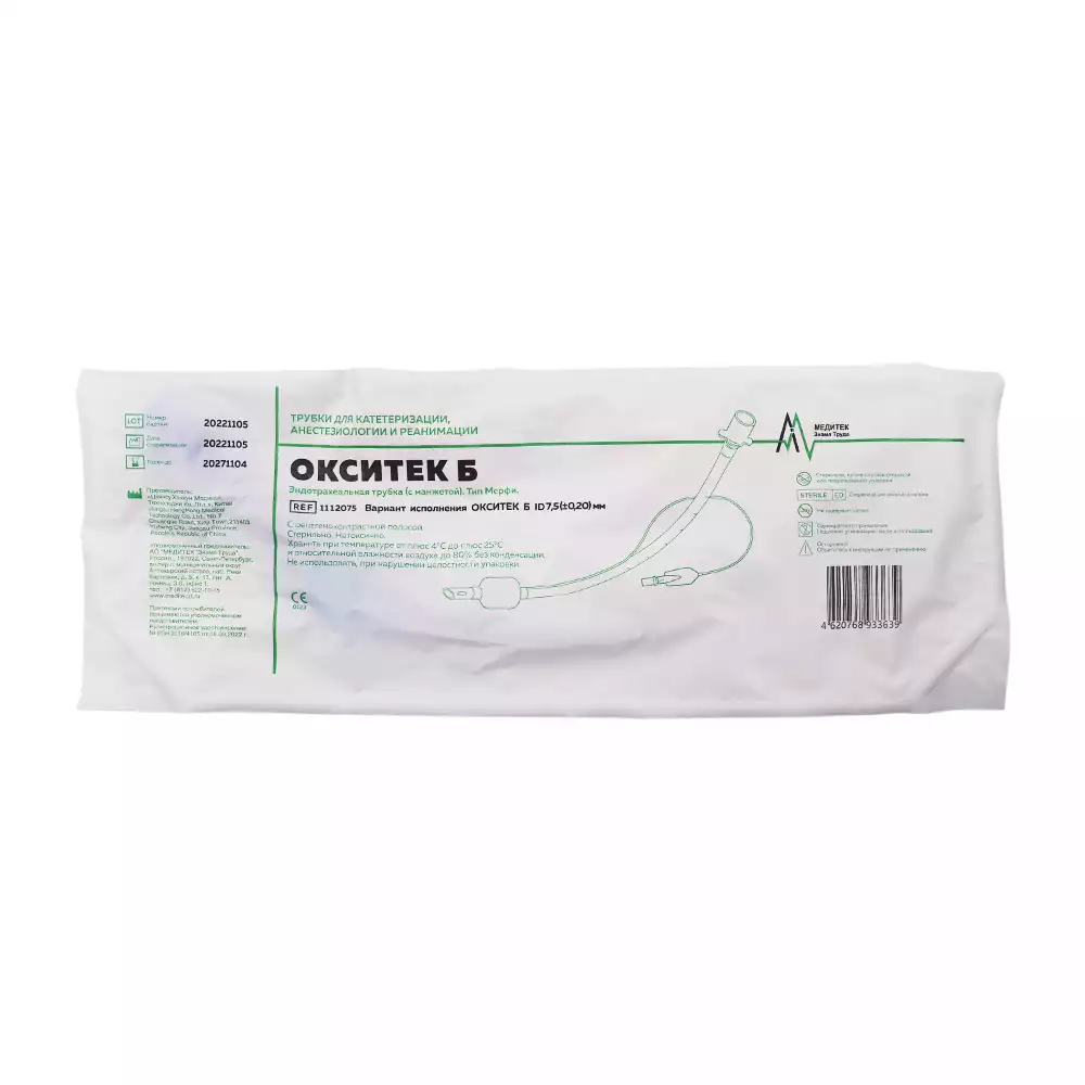 Эндотрахеальная трубка Окситек Б, размер №7,5, оснащенная манжетой, стандартным коннектором 15 мм и рентгеноконтрастной полосой (РКП), является стерильным медицинским изделием, предназначенным для обеспечения проходимости дыхательных путей.
